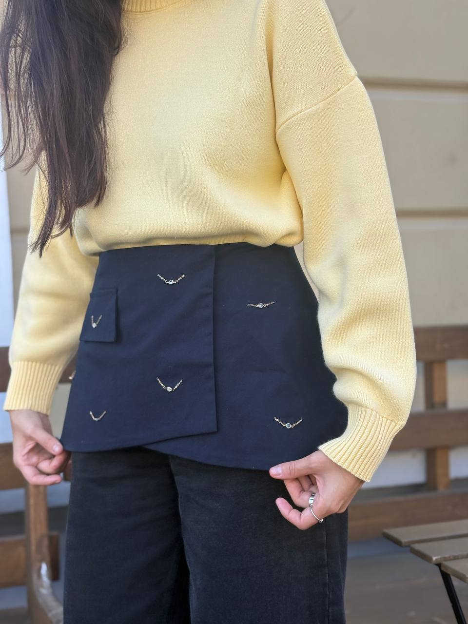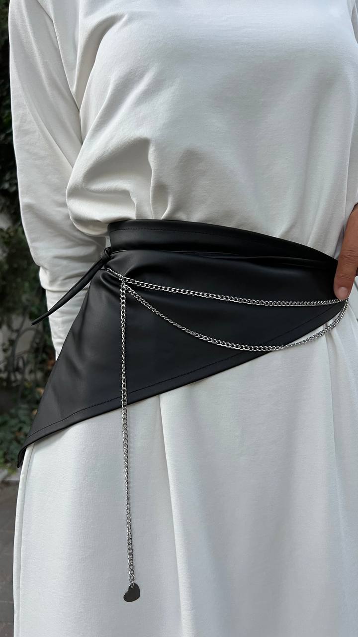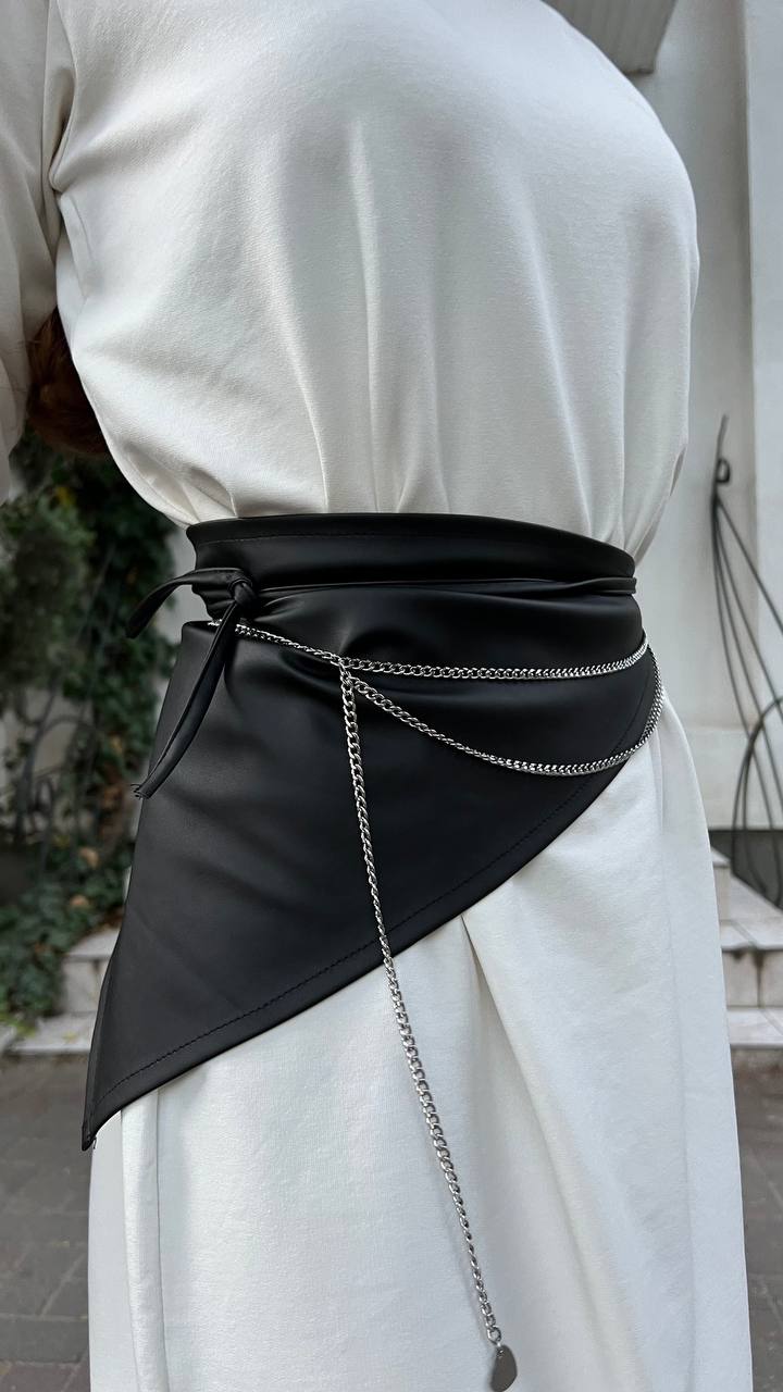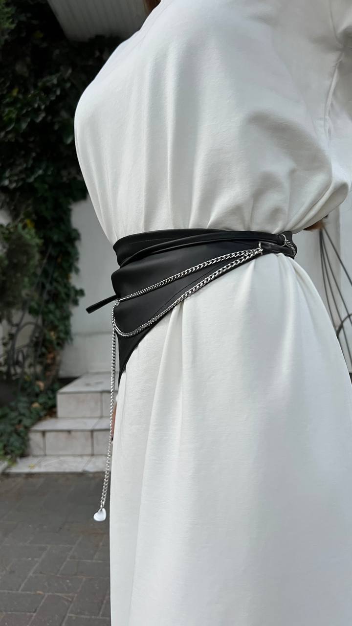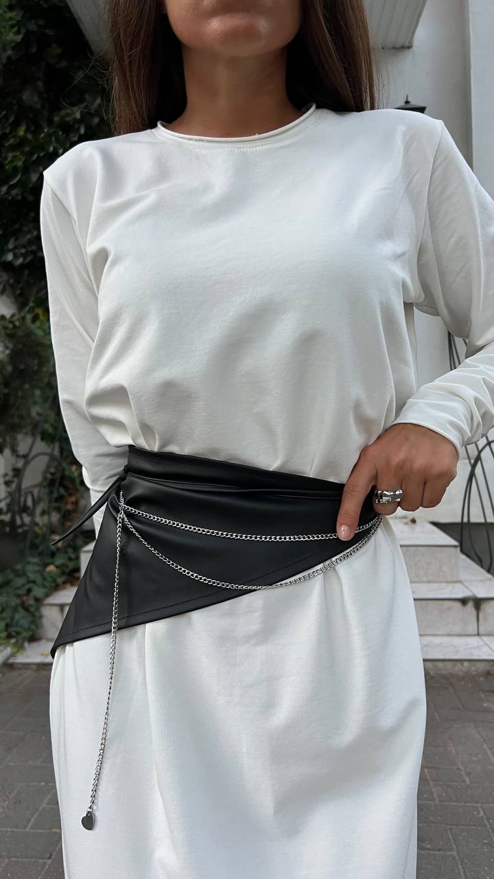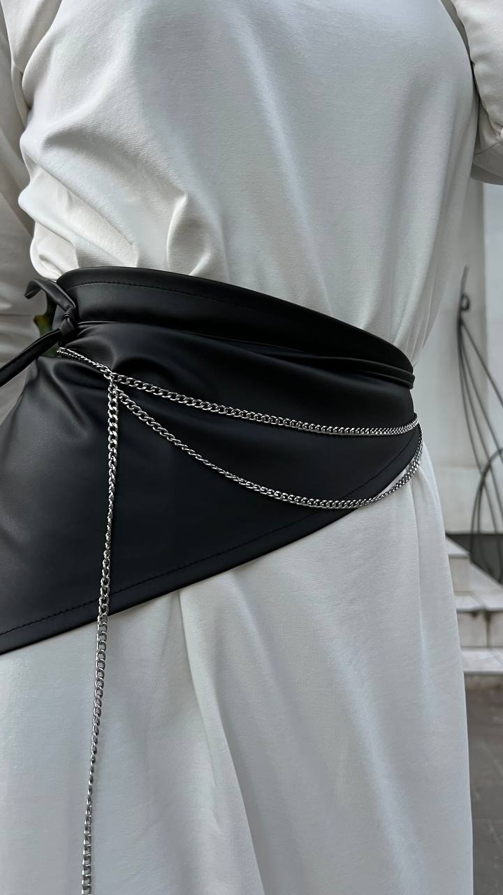 Эффектный акцентный аксессуар - пояс-баска из плотной костюмной ткани, расшитый вручную золотыми или серебристыми цепочками с декоративными камнями.