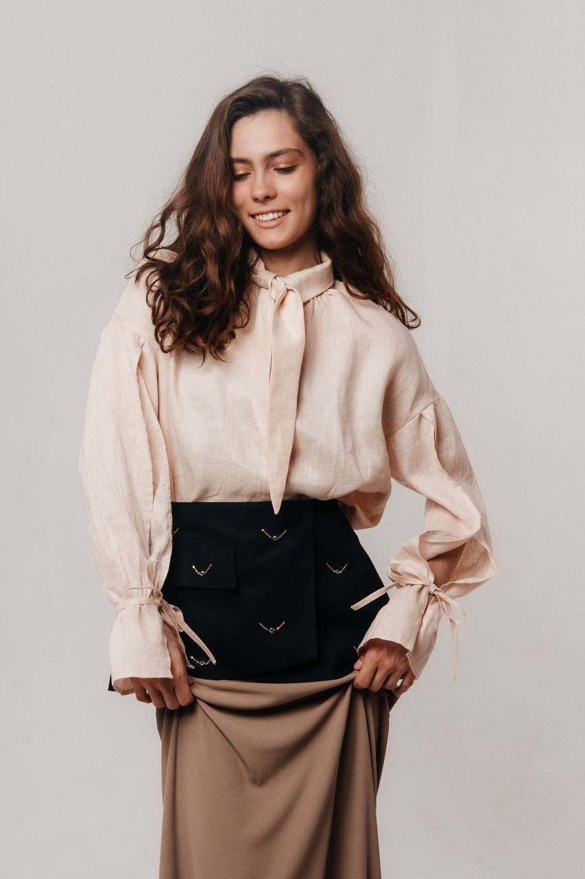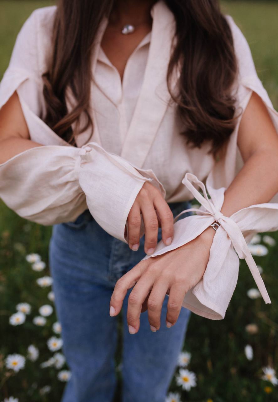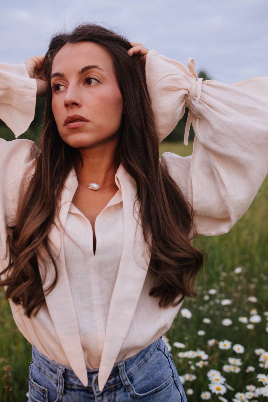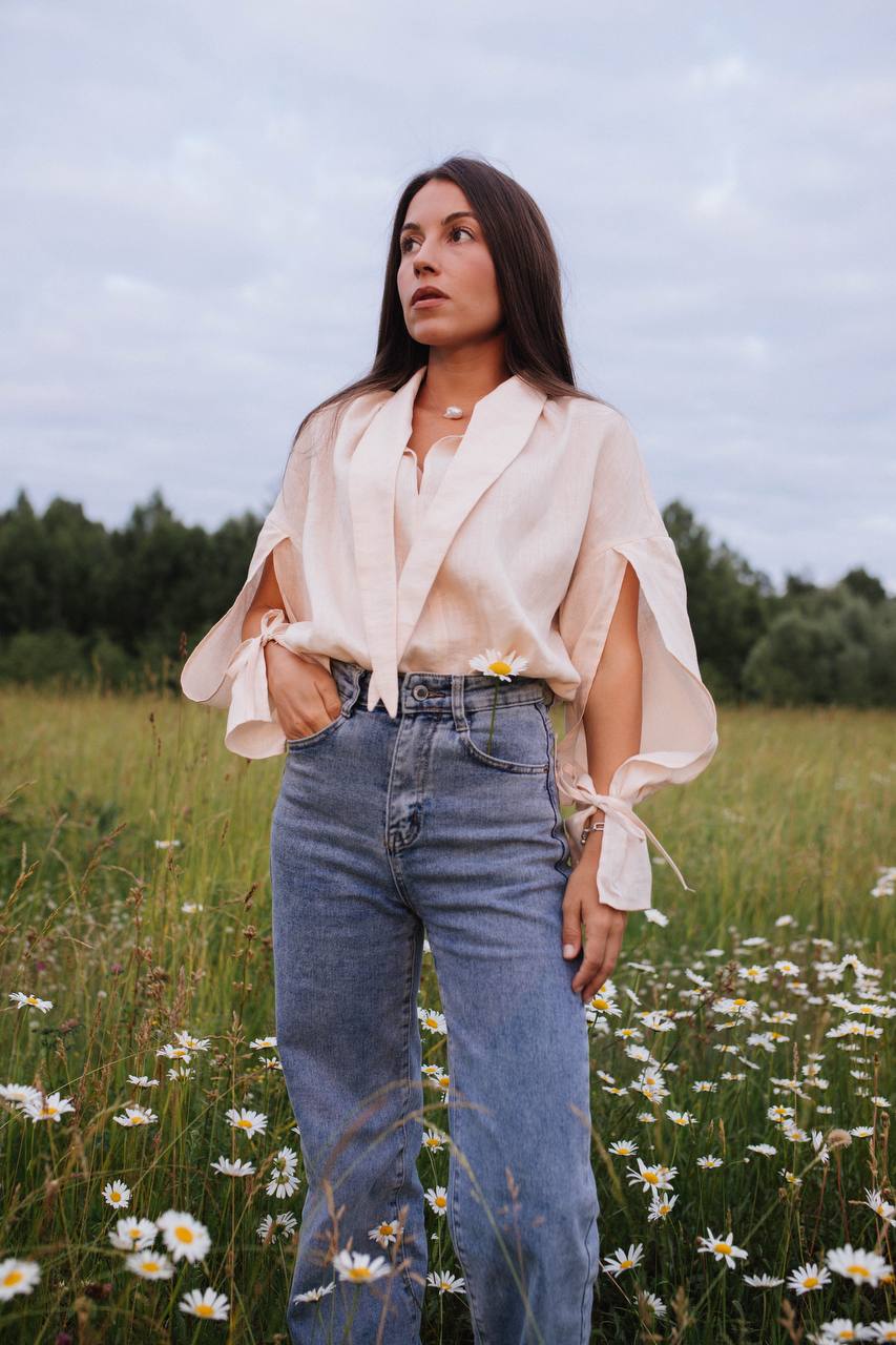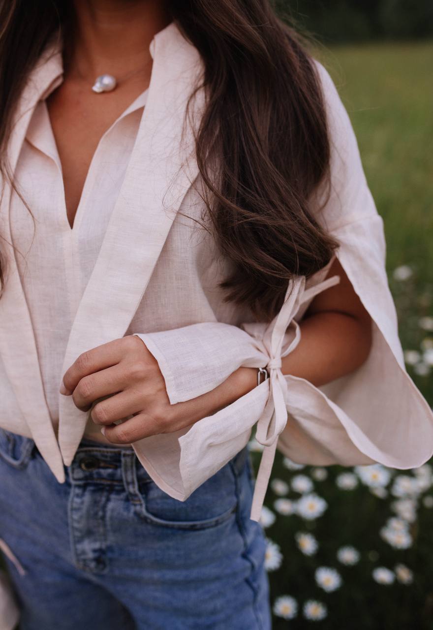 Мы сшили эту модель из 100% премиального льна, который обладает нежной невесомой текстурой и имеет деликатный жемчужный блеск. На ощупь ткань плотная, но при этом нежная, словно вуаль.