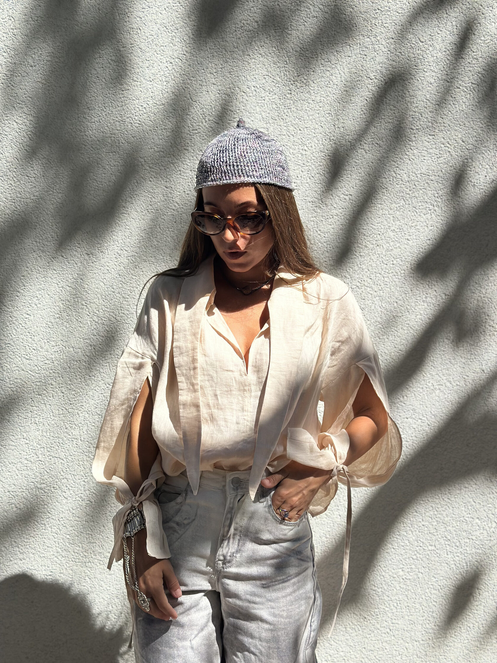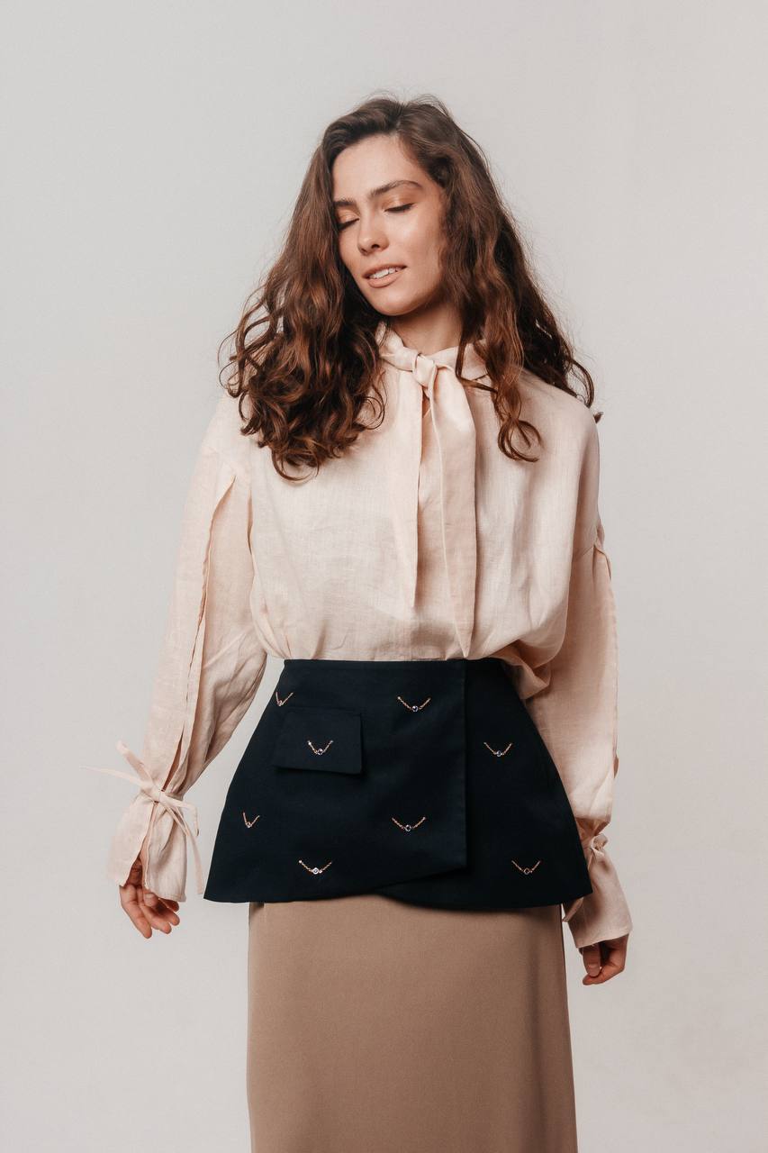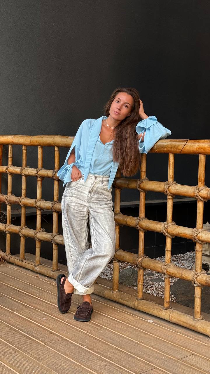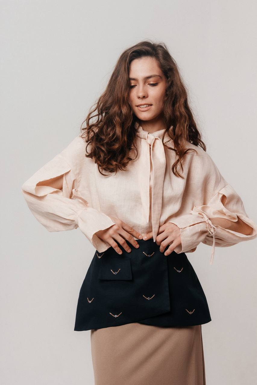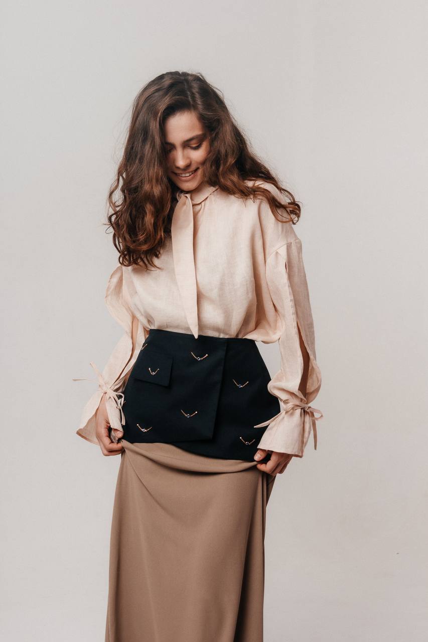 Мы сшили эту модель из 100% премиального льна, который обладает нежной невесомой текстурой и имеет деликатный жемчужный блеск. На ощупь ткань плотная, но при этом нежная, словно вуаль.